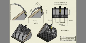 KAĞIT HURDA KOVASI ÜSTTE 3 KANCALI TEK PİSTONLU KANCA MAKSİMUM AÇILMA 1710 MM KOVA GENİŞLİĞİ 1680 MM ATAŞMAN DERİNLİK 1631 MM AĞIRLIK 640 KG
